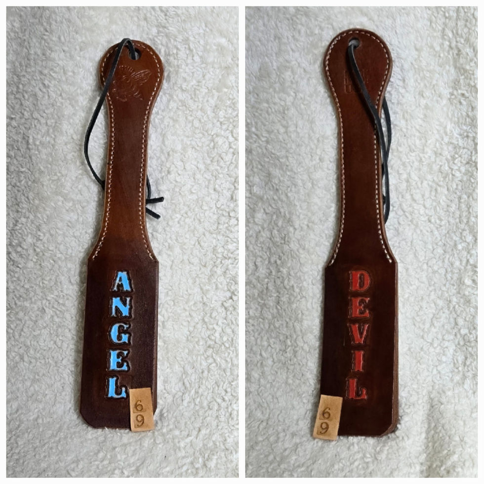 Experience the perfect blend of artistry and craftsmanship with Godbe Leather’s Angel/Devil Paddle. Made from full grain leather in a rich dark brown, this paddle features a striking angel in powder blue on one side and a bold devil in red on the other, offering dual personalities for any setting. Designed with a leather lace at the top of the handle, it ensures a secure grip whether you choose to use it for play or display. Meticulously crafted by a local business committed to quality and durability, this paddle is as functional as it is visually captivating. Add a distinctive touch to your collection with a piece that reflects both elegance and edge.
