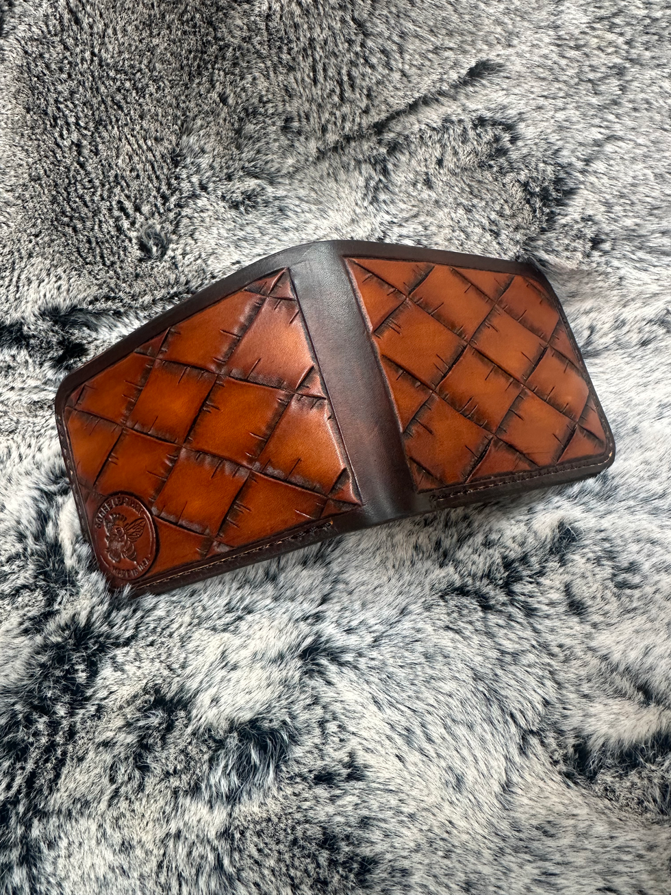 Crafted with meticulous attention to detail, the Hand Tooled Basketweave Moab style wallet in Saddle Tan with Dark Brown border showcases Godbe Leather’s commitment to quality and durability. Designed for everyday use, it features 4 ultra secure card slots and a long cash pocket for organized convenience. The interior combines light brown and dark brown leather, reflecting our dedication to craftsmanship and timeless style. This wallet embodies the local tradition of hand tooling while providing functional elegance for discerning customers. Trust Godbe Leather to deliver products that blend artistry with lasting value.